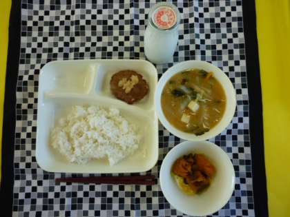 和風おろしハンバーグ、みそ汁、かぼちゃのいとこ煮、ご飯、牛乳