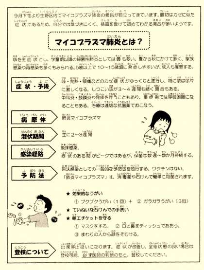 9月下旬より生野区内でのマイコプラズマ肺炎の報告が目立ってきています。最初は風邪に似た症状であるため、自分では気づきにくく、検査を受けてはじめてわかる場合が多いようです。保健だより10月号の裏面に、詳しく載せています。