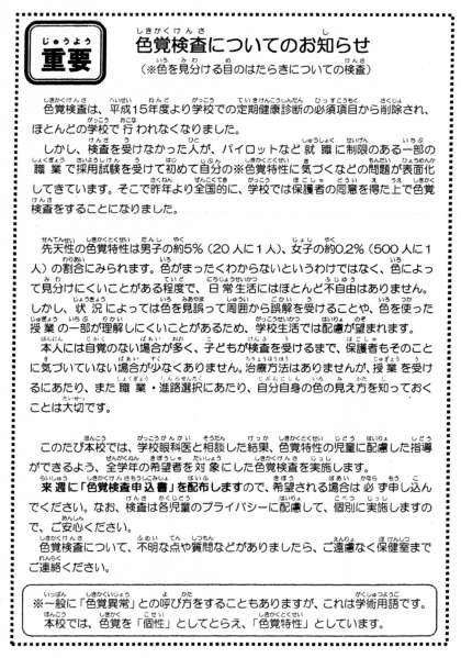 昨年より全国的に、保護者の同意を得た上で、色覚検査をすることになりました。