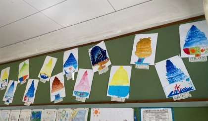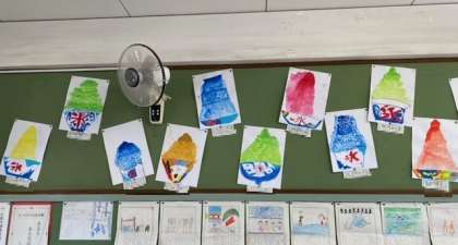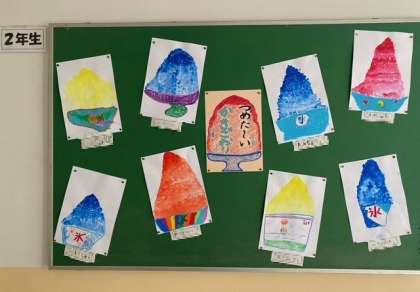 2年生の子どもたちが、図画工作科の時間に絵の具とクレパスを使って描いた「冷たいかき氷」です。