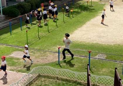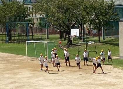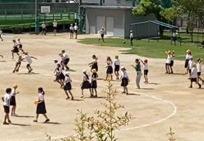 運動場では、子どもたちが鬼ごっこやドッジボールをして遊んでいます。