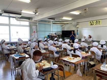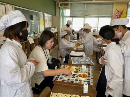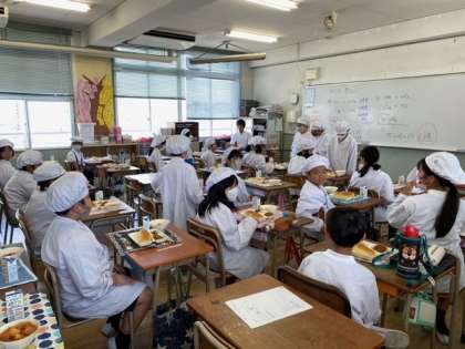 教育実習生が所属する5年生1組では、何人かの児童が実習生に給食を運んでいました。 親切ですね。