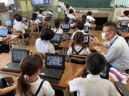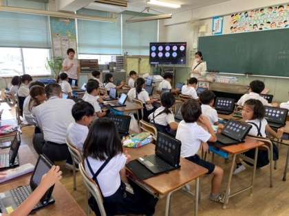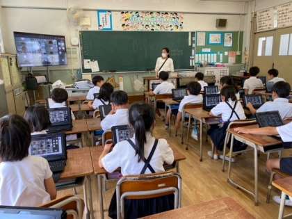 先生の問いかけに応じて、子どもたちが楽しそうに返事をして、端末に向かって手をふっていました。