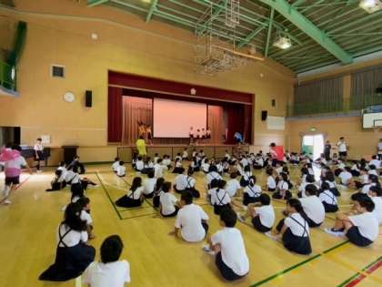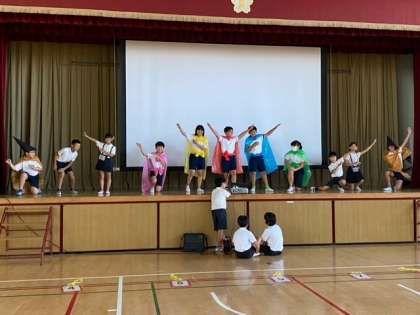 あいさつのすばらしさを伝えるため、「あいさつレンジャー」が舞台へ走ってきました。