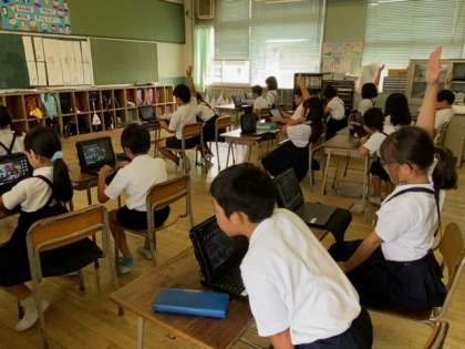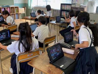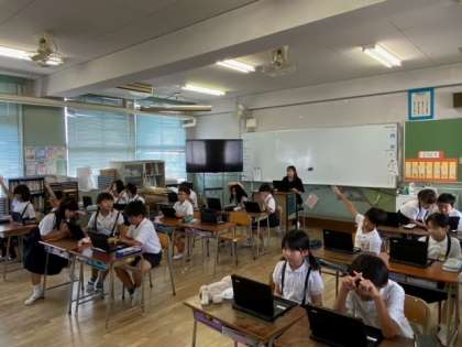 2組では、子どもたちがタブレット端末で、先生とつながる練習をしていました。