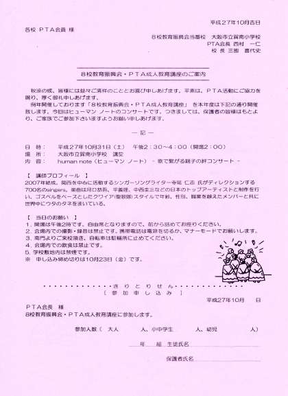 再度、PTA成人教育講座・8校教育振興会のご案内をいたします。10/31(土)午前中 土曜授業(子どもフェスティバル)があります。同日の午後より巽南小学校の講堂で開催いたします。human note「ヒューマン ノート」−歌でつながる親子の絆コンサート− に親子でご参加下さい。