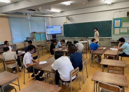 教員の研修です。大阪市の研修を受講した教員が講師として伝達講習(研修)を行いました。