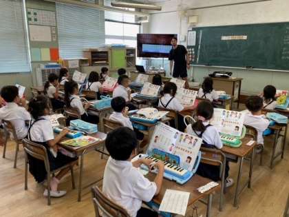 「けんばんハーモニカ」の使い方や音の出し方を学んでいました。