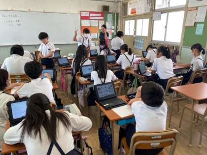 1組の図画工作科では、野菜や果物の絵をかき、言葉を添えて作品に仕上げていく取り組みをしています。