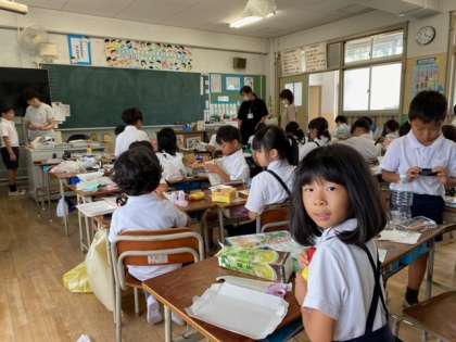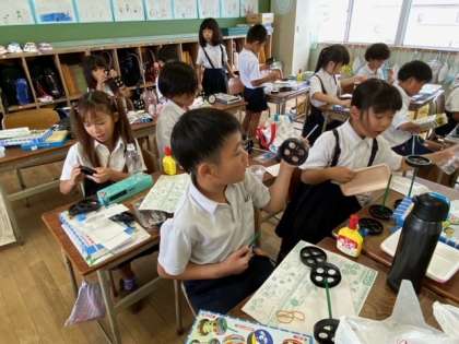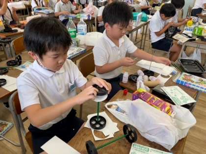 生活科の学習で「タイヤを使った楽しいおもちゃづくり」です。