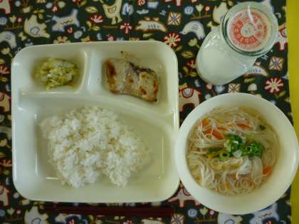 かつおのガーリック風味焼き、にゅうめん、はくさいの甘酢づけ、ご飯、牛乳