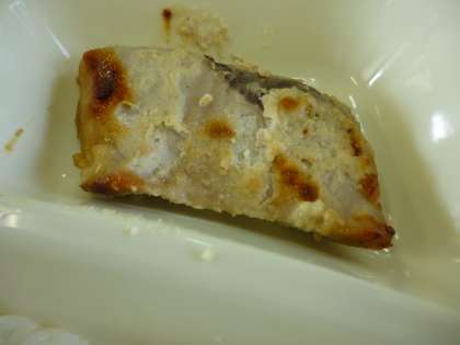 かつおににんにく、塩、こしょう、ノンエッグドレッシングで下味をつけて焼いています。