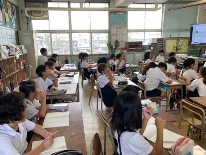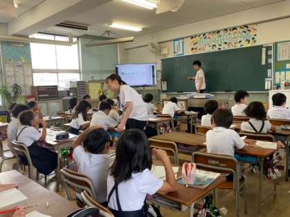 子どもたちが、テレビ画面を見ながら先生の説明を聞いています。