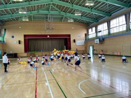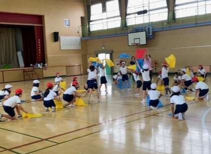 子どもたちが、旗を手に、曲に合わせて踊っていました。