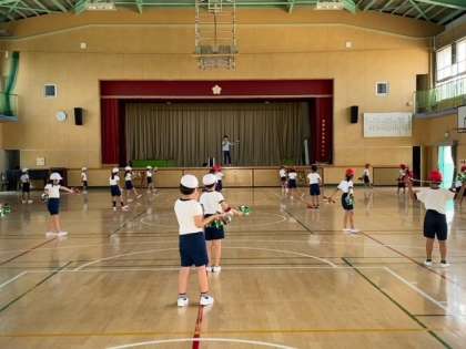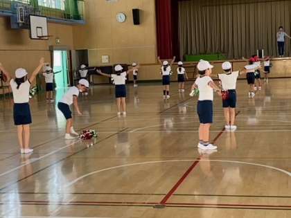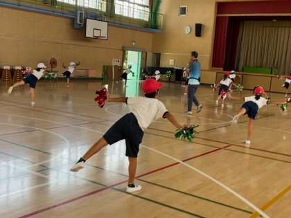 子どもたちが、ポンポンを手に、リズムに合わせて踊っていました。