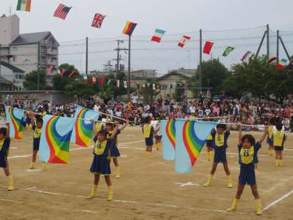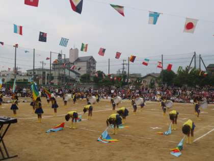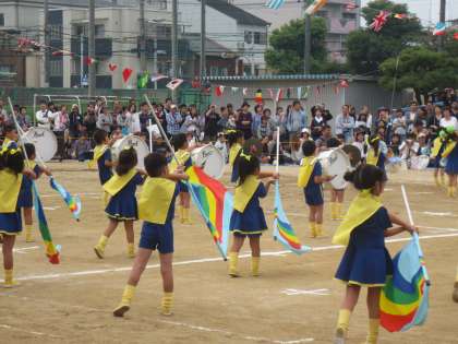 午前の部最後の演技です。会場のみなさんが待ちに待った「鼓隊とフラッグ隊」の演技です。