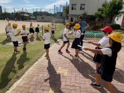 2組の理科は、屋外で「空気でっぽう」の実験をしていました。