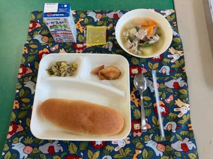 鶏肉のガーリック焼き、スープ煮、野菜のソテー、コッペパン、アプリコットジャム、牛乳