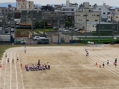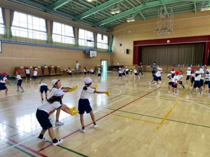 2年生が運動場で、1年生が体育館で、それぞれ団体演技の練習をしていました。