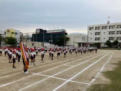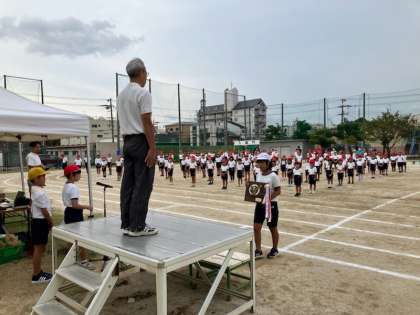 児童入場から開会式、ラジオ体操までを通して行う予定でしたが、雨が降ってきたため、途中で終了しました。