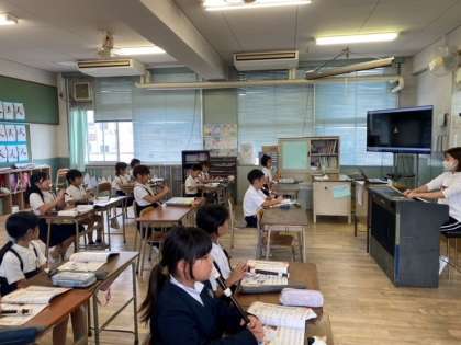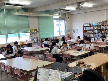 1組の図書の時間です。子どもたちが、図書館で静かに本を読んでいます。