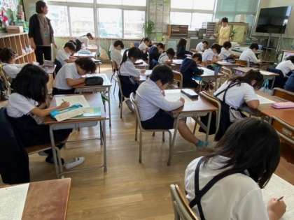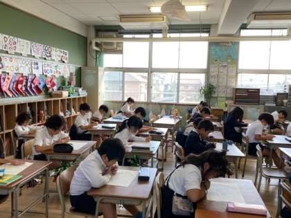 国語科のテストです。問題文を読んで自分で考え、各問いに答えていました。
