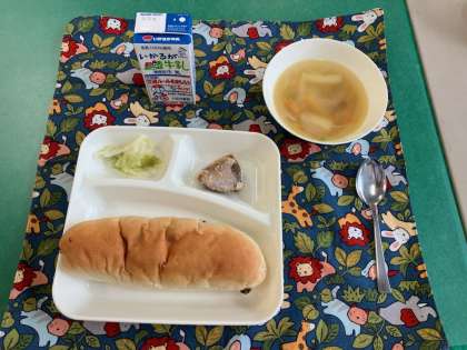 かつおのガーリックマリネ焼き[ノンエッグドレッシング]、ウインナーとじゃがいものスープ、キャベツのサラダ、レーズンパン、牛乳