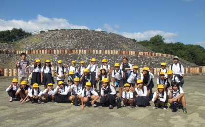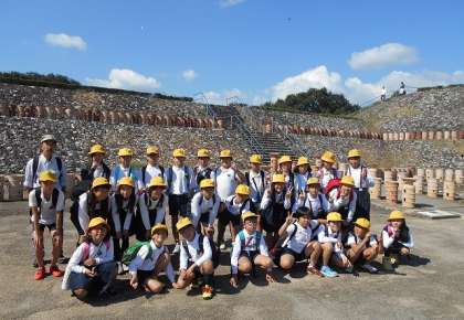 ナガレ山古墳の見学をした後、みんなで記念撮影をしました。たくさん並んだ埴輪にびっくりしていました。