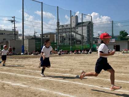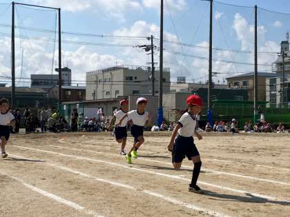 徒競走です。元気いっぱいの1年生がトラックをいっしょうけんめい走ります。