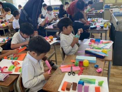 色画用紙を切り、つなげたり 丸めたり 折ったりして白い画用紙にはり、素敵な作品に仕上げていました。