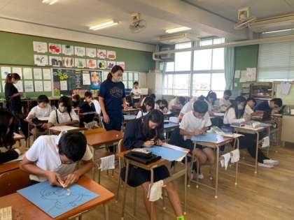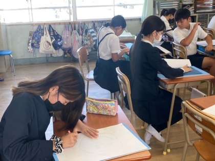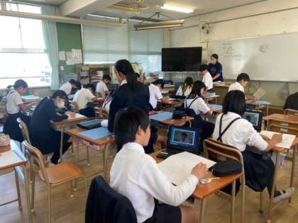2組の子どもたちが、パソコンの映像をもとに描いた自画像を、カーボン紙で版木に写し、彫刻刀を使って彫っていきます。