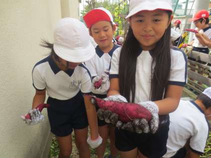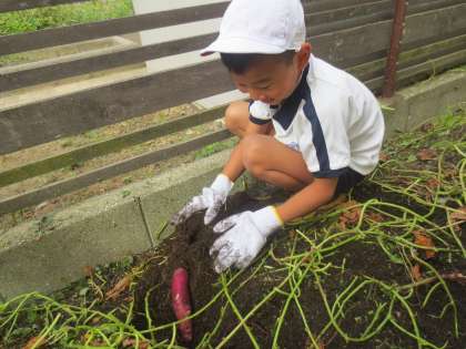 学校のさつまいも畑で芋ほりをしています。夏に工事をして新しく作った畑だったので、かなり植える時期が遅くなってしまいました。できていなかったら・・・と掘るまで心配をしていました。子どもたちが掘りはじめると、美味しそうなさつま芋がたくさん出てきました。小さくてもおいもパーティーができるほど収穫していました。子どもたちの顔を見てとても嬉しくなりました。
