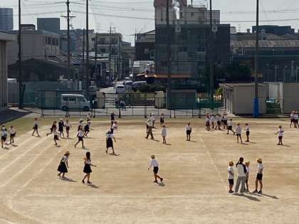 運動場で、子どもたちがドッジボールをしています。