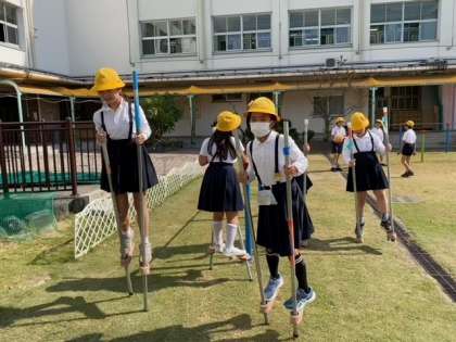 芝生エリアでは、3年生の女子児童が、器用に「竹馬」を乗りこなしていました。