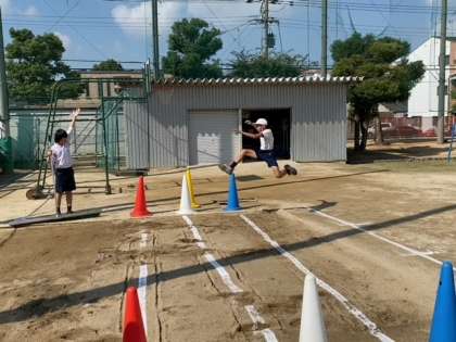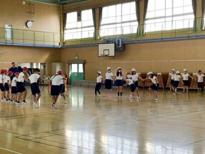 1組は運動場で、走り幅跳びの練習を、2組は体育館で、知恵を使って(手をつないだまま)輪を後方へ送る動きをしていました。