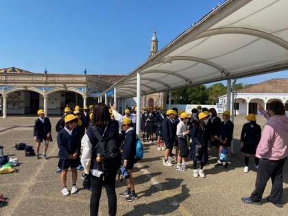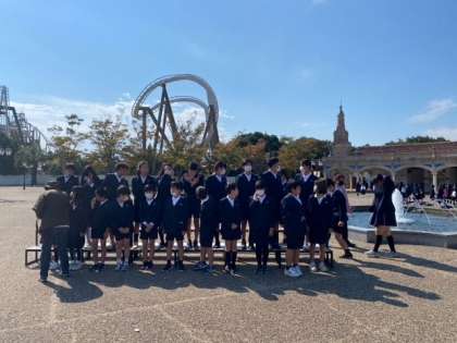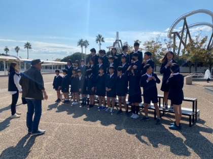 スペイン村に到着しました。入場後みんなで集合写真を撮りました。
