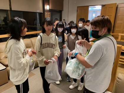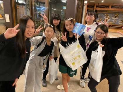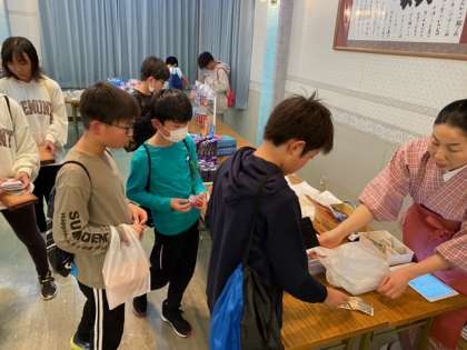 買い物を終えた子どもたちは、両手にいっぱいのおみやげを持っています。