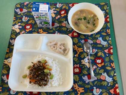 もずくと豚ひき肉のジューシー、さつまいものみそ汁、焼きれんこん、ごはん、牛乳