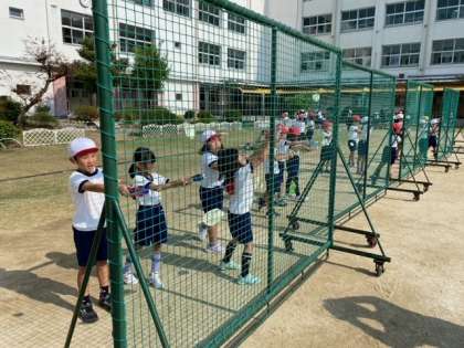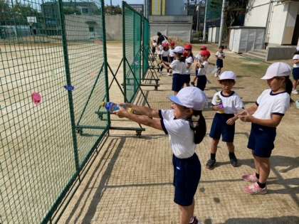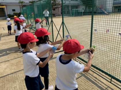 ペットボトルを使って、自分たちで作った「水でっぽう」で、鉄棒につるしたボードや防球ネットにつけたボードをめがけて「的遊び」をして楽しんでいました。