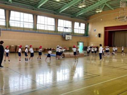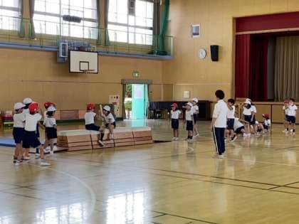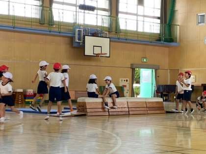 2年生の子どもたちが、体育館で「とび箱」を使った運動遊びをしていました。
