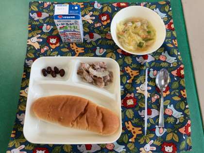 豚肉のバジル焼き、スープ、うずら豆のグラッセ、パン、ソフトマーガリン、牛乳