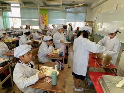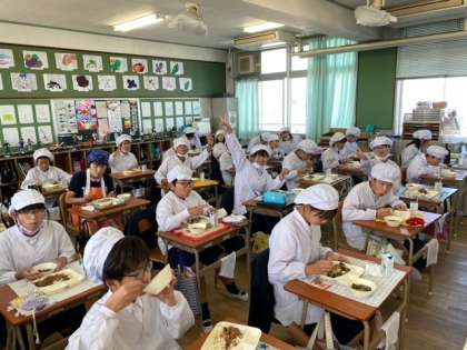 5年生・6年生の教室でも、あたたかい雰囲気の中で子どもたちが給食を食べています。
