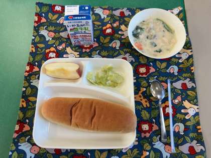 きのこのクリームシチュー、キャベツのピクルス、りんご、パン、牛乳