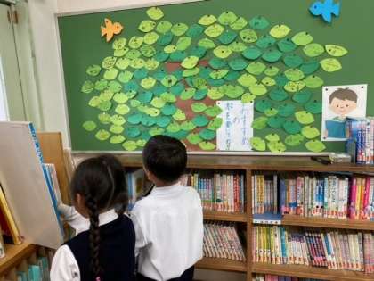 子どもたちの「おすすめの本」がたくさん葉っぱに書かれています。