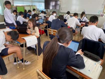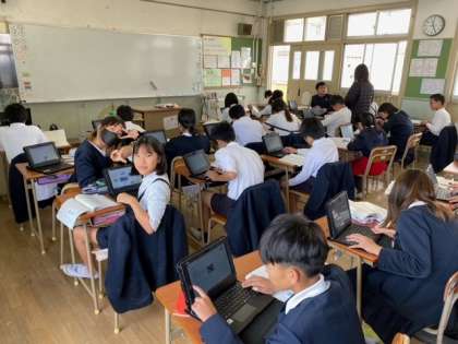 子どもたちが、タブレット端末で情報を収集し、事実に対して自分がどう考えたかを明確な言葉で表現していました。