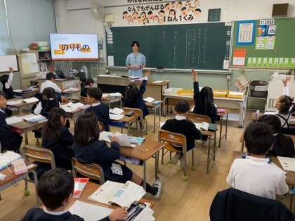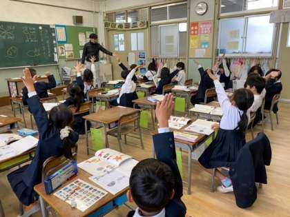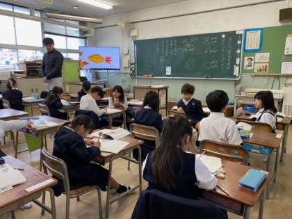 教科書の写真を見て想像し、友達同士で楽しく、話をつなぐ言葉を使って想像を広げています。