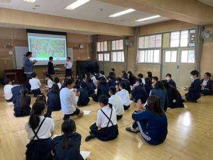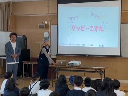 吉本興業から若手芸人 「グッピーこずえ かわばたくん」のお二人をお招きしての出前授業です。