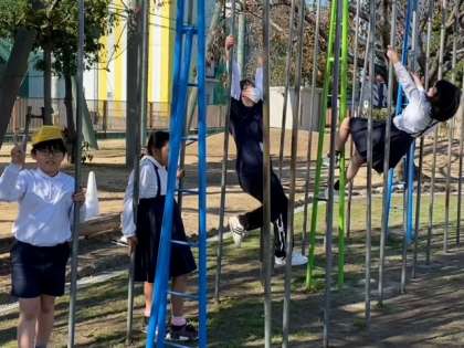 インターンシップの大学生も、児童と一緒に「のぼり棒」をしていました。