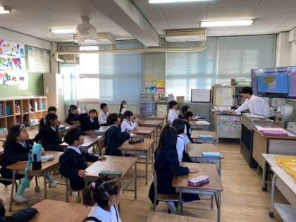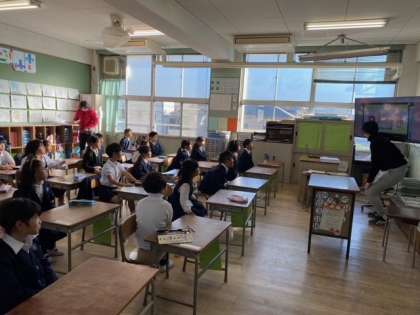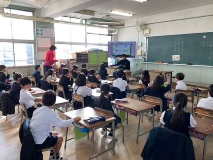 1年生の教室から、子どもたちの元気な英語の声が聞こえてきます。