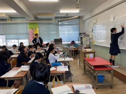 距離、時間、速さの関係について、問題文を読み、数直線や表を使って 考えたことを発表していました。